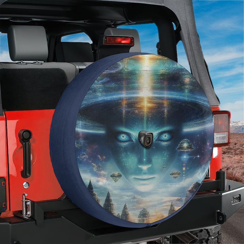 Embark on a journey through the cosmos with this mesmerizing tire cover! This design is a true showstopper featuring a celestial being with piercing eyes that seem to unlock the mysteries of the universe. The ethereal figure is surrounded by otherworldly landscapes, floating UFOs, and radiant galactic energy, creating a vivid tapestry of interstellar wonder. Whether you're a sci-fi fan, an adventurer dreaming of the stars, or someone who loves bold and unique designs, this tire cover is the perfect cosmic companion for your vehicle. Prepare for stares that are genuinely out of this world!