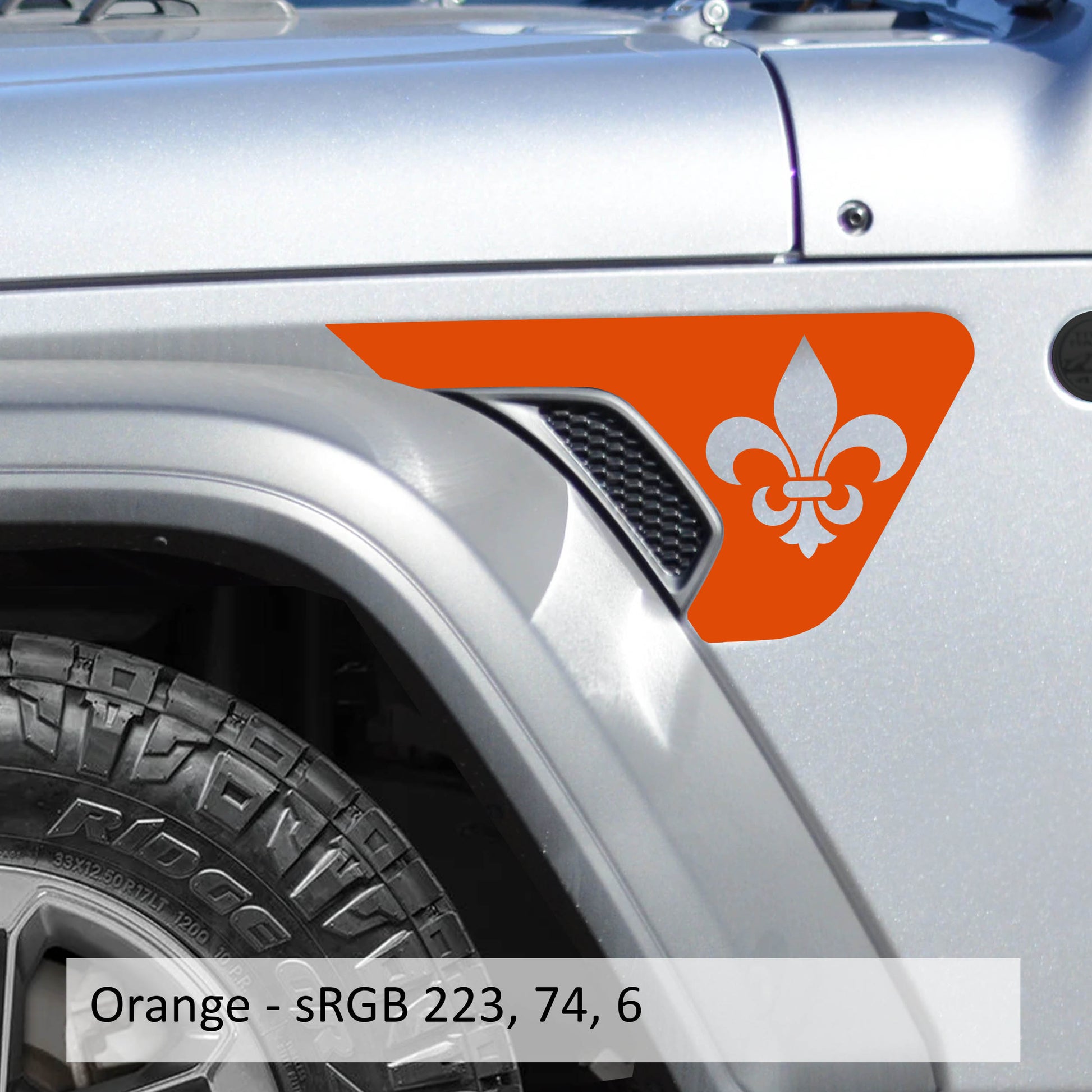 Elevate the look of your Jeep Wrangler JL, JLU (2018—current), or Gladiator JT (2020—current) with our premium Fleur De Lis Fender Vent Vinyl Decals. Designed to withstand the elements, these decals add a personalized touch to your ride, making it truly unique.