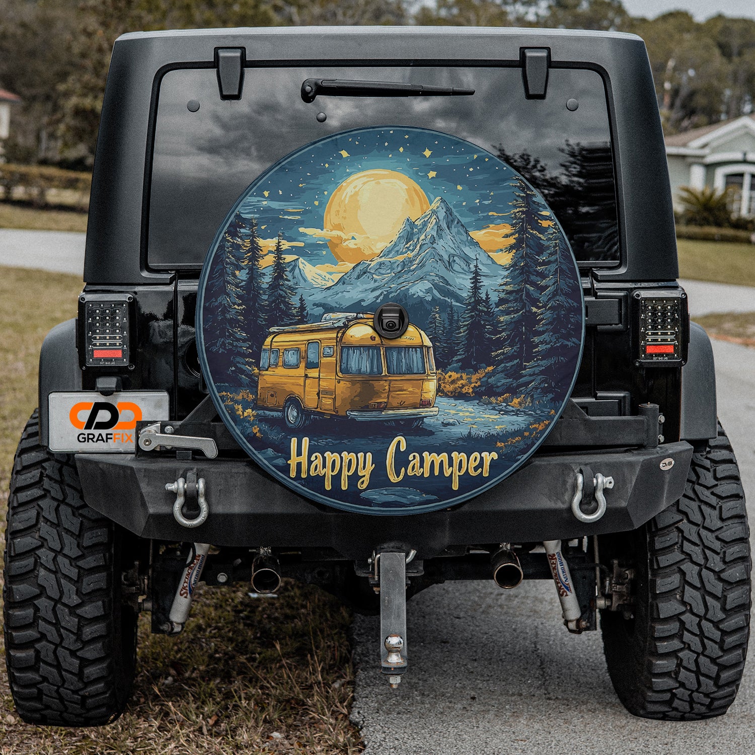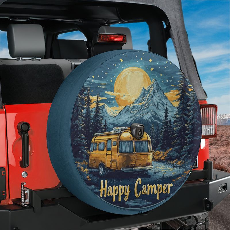 Set off on your next adventure with the Happy Camper Spare Tire Cover, the perfect homage to your love of the great outdoors! Featuring a nostalgic yellow camper parked beneath a glowing full moon and majestic mountains, this design captures the magic of peaceful nights under the stars. Surrounded by towering evergreens and bathed in celestial charm, this tire cover is ideal for outdoor enthusiasts, road trippers, and wanderlust dreamers. Wherever your journey takes you, let this delightful design showcase your adventurous spirit and add a touch of scenic joy to your ride!