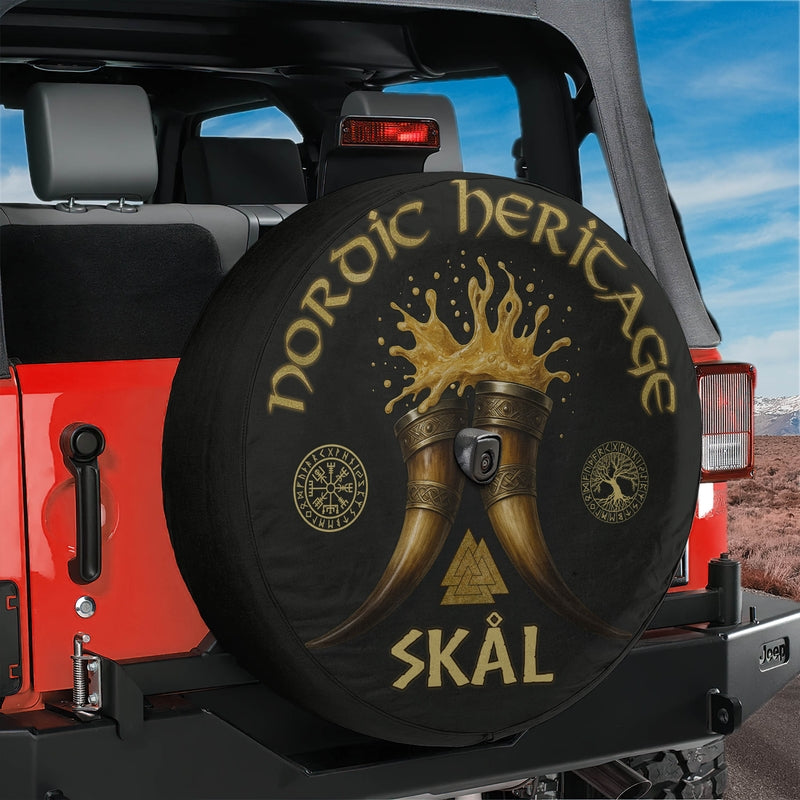 Raise a toast to the old gods wherever you roam with the Nordic Heritage Skål Toast spare tire cover. Featuring clashing Viking horns, runic symbols, and an optional backup camera hole, it brings bold Norse energy to your Jeep, Bronco, RV, or overland rig.