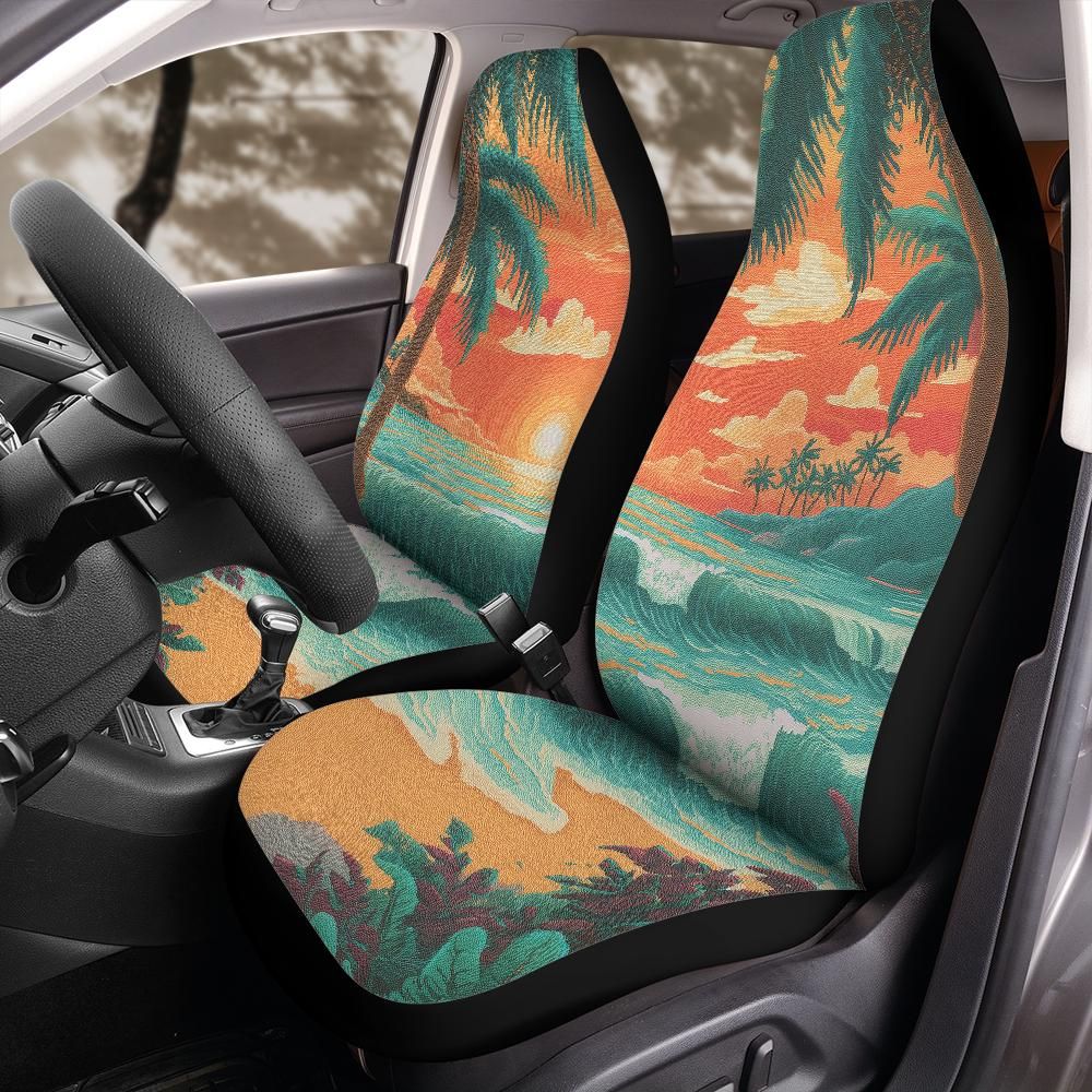 Retro Beach Car Seat Covers with palm trees and ocean waves bring coastal vibes to every ride. These vintage-style blue and orange seat covers are the perfect blend of style and protection for your front seats. These stylish, universal-fit seat covers are ideal for drivers who want to make a bold statement while preserving their vehicle's value. Designed for comfort and durability, they're as practical as they are eye-catching.