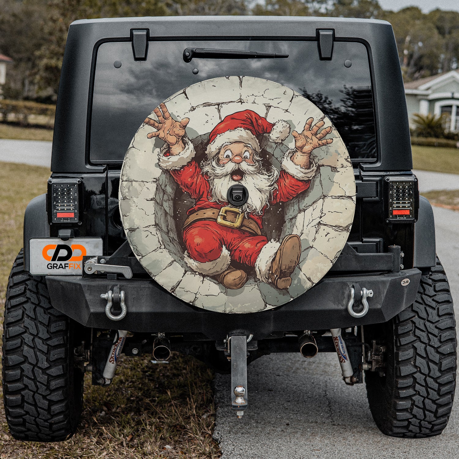 Add a touch of festive humor to your vehicle with the Santa's Great Chimney Escape Spare Tire Cover! Featuring a playful illustration of jolly old St. Nick mid-fall, this design captures the hilarious side of Christmas traditions gone slightly awry. With his hands thrown up in surprise and boots bracing for impact, Santa's cheerful mishap brings holiday cheer and a smile to everyone who sees it. Perfect for spreading laughs during the holiday season, this tire cover is a must-have for festive road trips and seasonal adventures!.