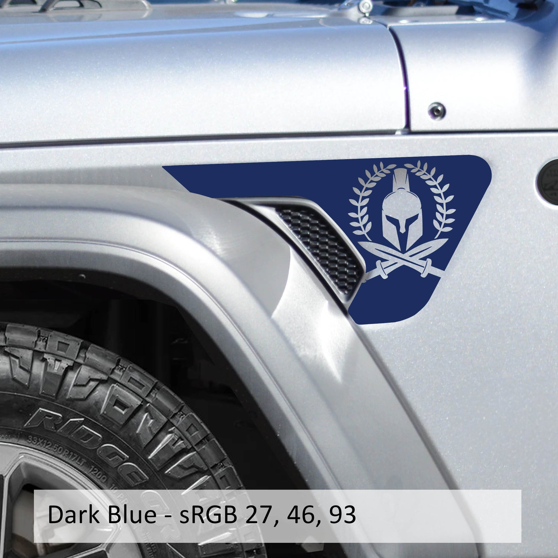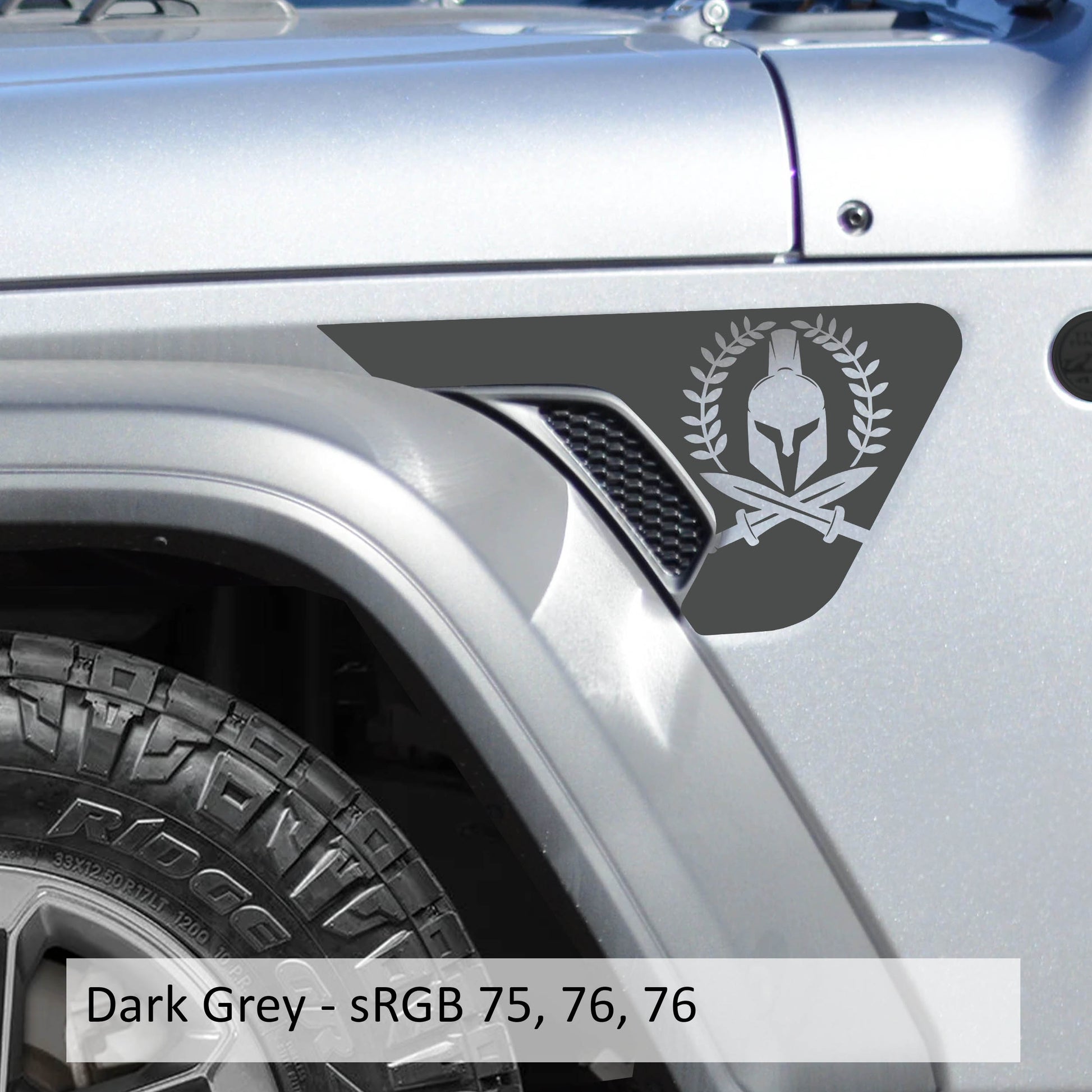 Elevate the look of your Jeep Wrangler JL, JLU (2018—current), or Gladiator JT (2020—current) with our premium Spartan Laurel Wreath Fender Vent Vinyl Decals. Designed to withstand the elements, these decals add a personalized touch to your ride, making it truly unique.