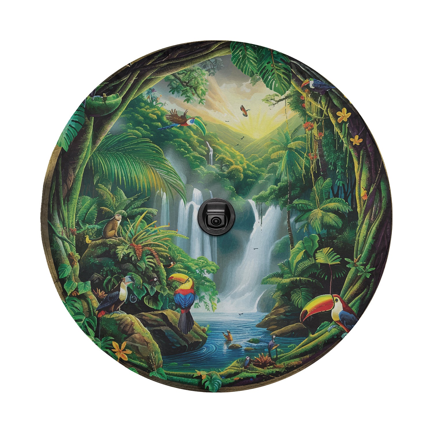 Bring a slice of lush rainforest magic to your vehicle with the "Tropical Paradise Escape" spare tire cover. This vibrant design captures the enchanting essence of a secluded tropical haven, featuring cascading waterfalls, colorful toucans, curious monkeys, and verdant greenery in every corner. Sunlight filters through dense foliage, illuminating this lively ecosystem where every creature appears as part of an untold adventure. Perfect for nature enthusiasts and tropical dreamers, this cover invites you to escape the ordinary, adding a splash of wild beauty and serenity to your journeys.
