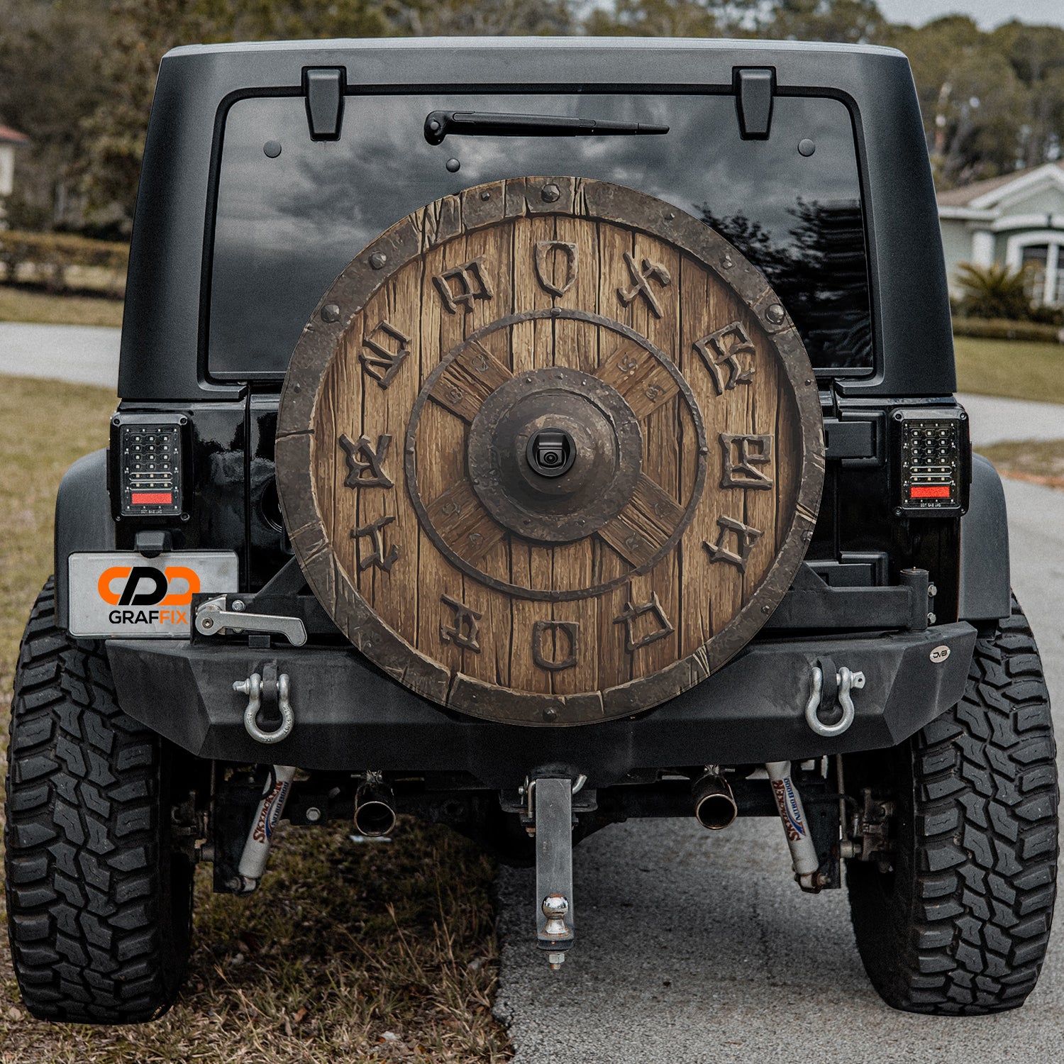 Unleash your inner Norse warrior with the "Viking Warrior's Shield" spare tire cover! Crafted to look like a rugged, battle-worn shield from the Viking era, this cover features detailed wood textures, reinforced iron rings, and mysterious runes hinting at ancient sagas and valorous tales. Ideal for those who have a passion for history and adventure or love a bold look, this design brings a fierce, timeless energy to your ride. With the "Viking Warrior's Shield" on your vehicle, you’re always ready to conquer the road ahead!